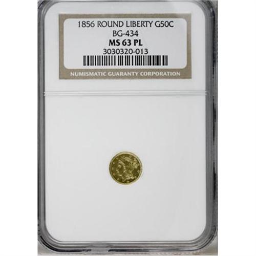 <B>1856 50C Liberty Round 50 Cents, BG-434, Low R.4, MS63 Prooflike NGC.</B></I> NGC Census: (0/0). PCGS Population (14/7). (#10470)<BR><BR><b>Shipping:</b> Coins & Currency (<a target="_blank" href="http://www.heritageauctions.com/common/shipping.php">view shipping information</a>)