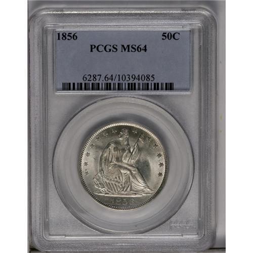 <B>1856<50C> MS64 PCGS.</B></I> Untoned with a bright sheen that is mostly frosty on the obverse and rather satiny on the reverse. The striking details are generally crisp except for obverse stars 7 through 13 and the lower parts of the eagle. A thin die crack extends across the lower edges of the date. A few minor marks and pinscratches define the grade of this visually pleasing near-Gem. Population: 21 in 64, 3 finer (5/06).