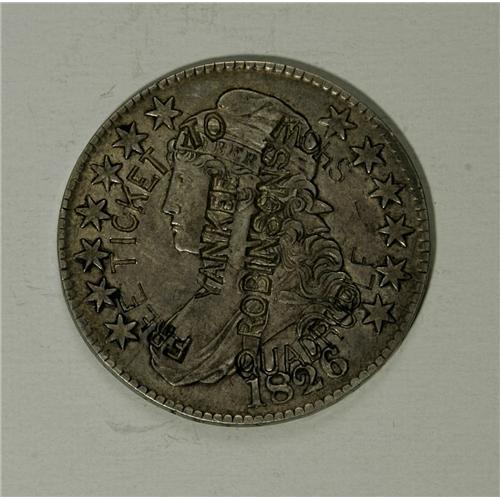 <B>(1856-59) Yankee Robinson Counterstamped 1826 Bust Half Dollar, Cincinnati, OH, Ci-178, AU-50, Uncertified.</B></I> Silver. Counterstamped FREE TICKET TO / YANKEE ROBINSONS / QUADRUPLE-SHOW on an AU 1826 Bust half dollar. This date is unlisted in the Rulau catalog; known dates are 1806, 1843, 1847, 1853, 1854-O, and 1855. Approximately 20 pieces are known of this counterstamp. This an exceptional coin/counterstamp, as the host coin and counterstamp are as fresh as the day they were applied by Fayette "Yankee" Robinson. The current Rulau catalog values it in Fine condition at $300. We believe this piece and the following lots should draw much interest from counterstamp collectors.<BR><BR><b>Shipping:</b> Coin/Currency (<a target="_blank" href="http://www.heritageauctions.com/common/shipping.php">view shipping information</a>)