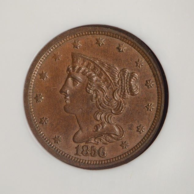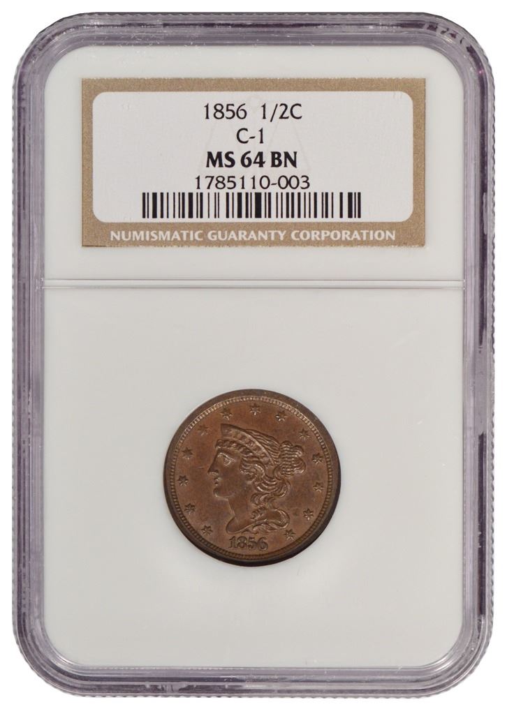 One 1856 Braided Hair Half Cent NGC MS64BN.