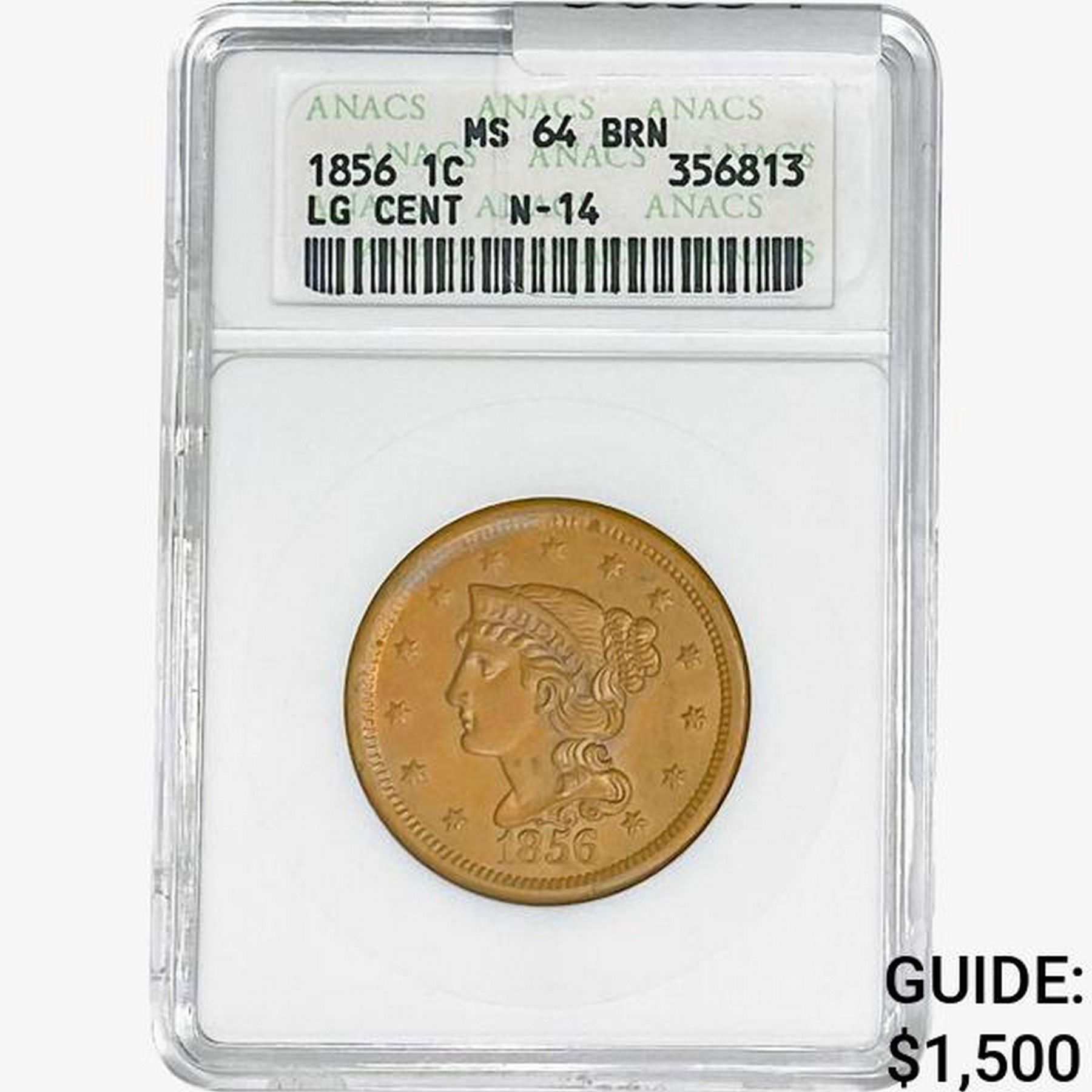 1856 Braided Hair Large Cent ANACS MS64 BRN N-14