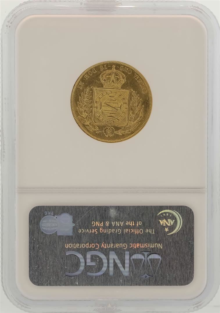One 1856 Brazil 10000 Reis Gold Coin NGC VF35. NGC Certified.