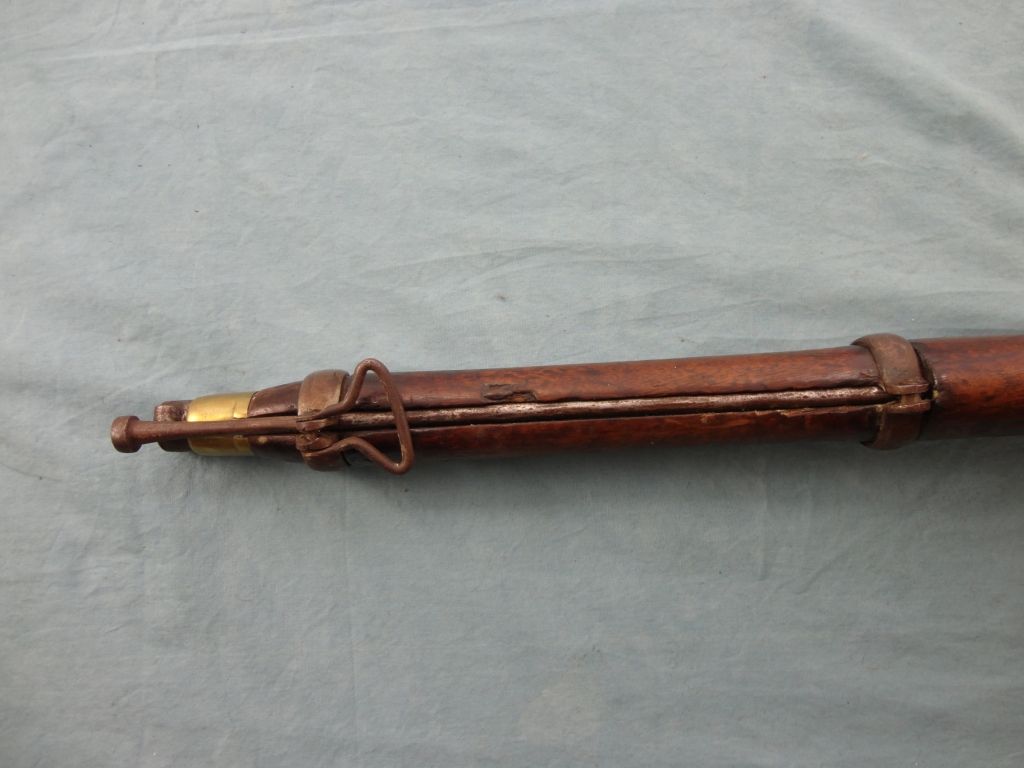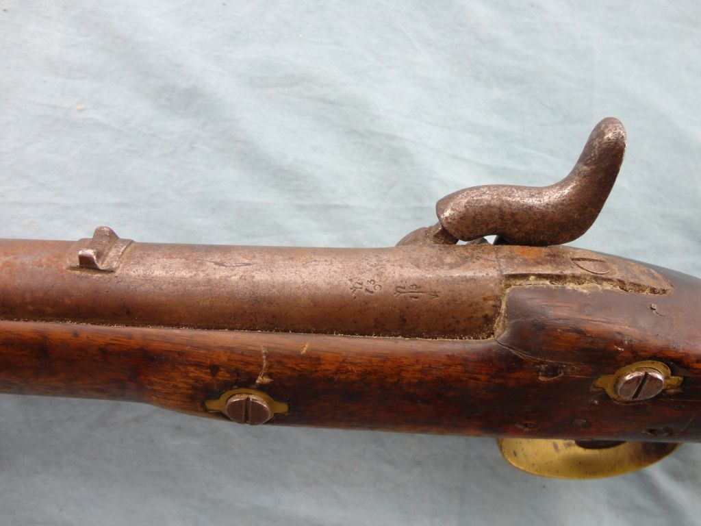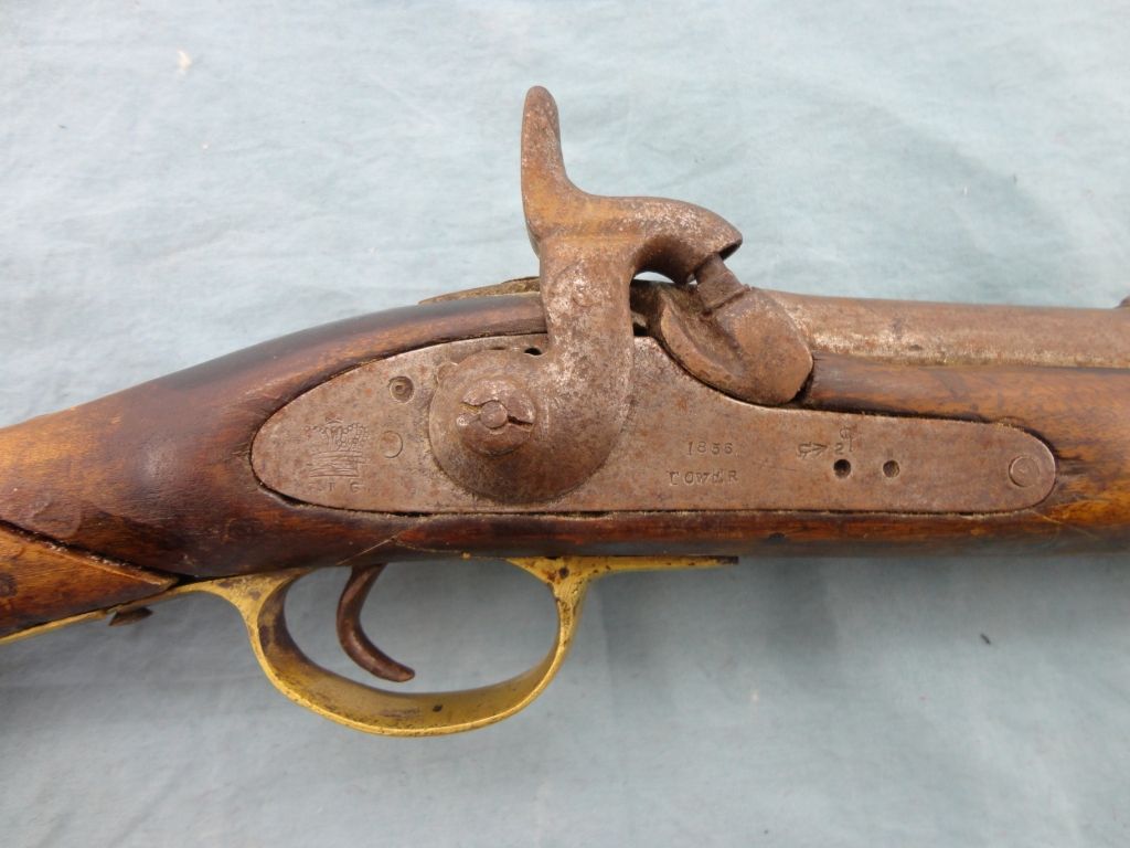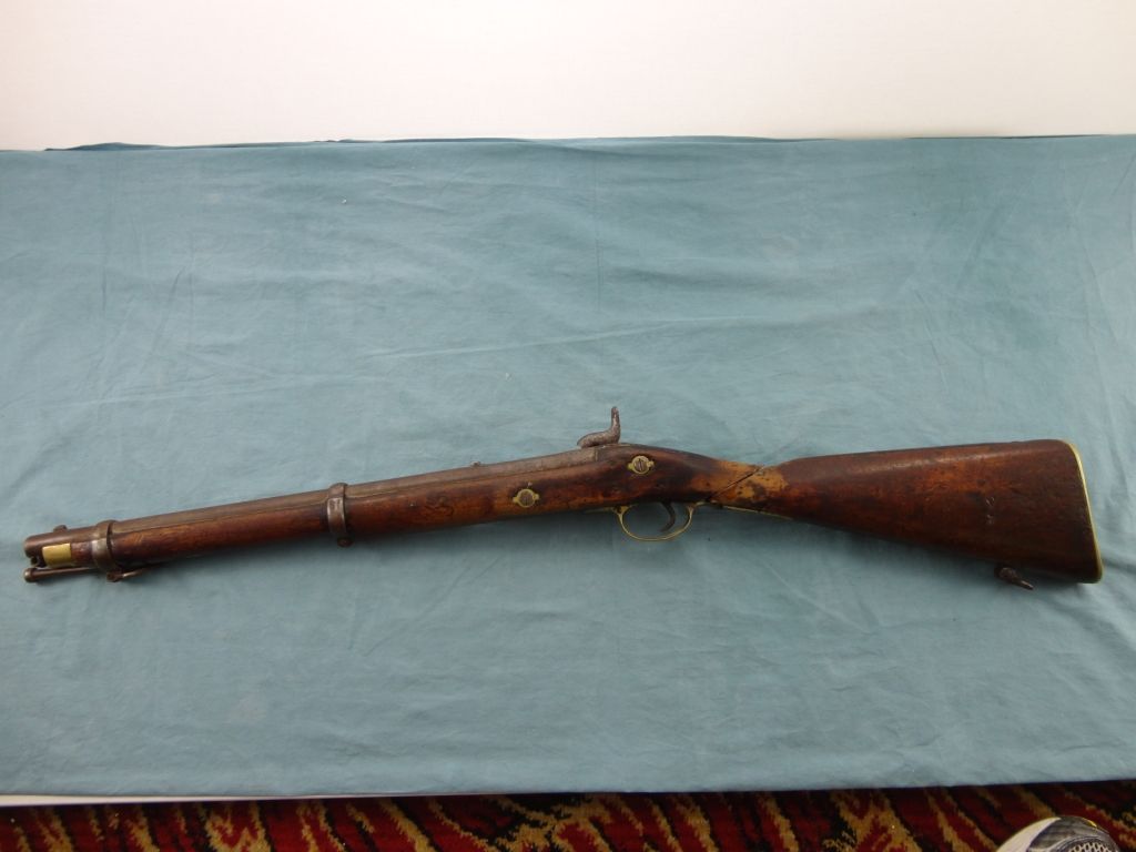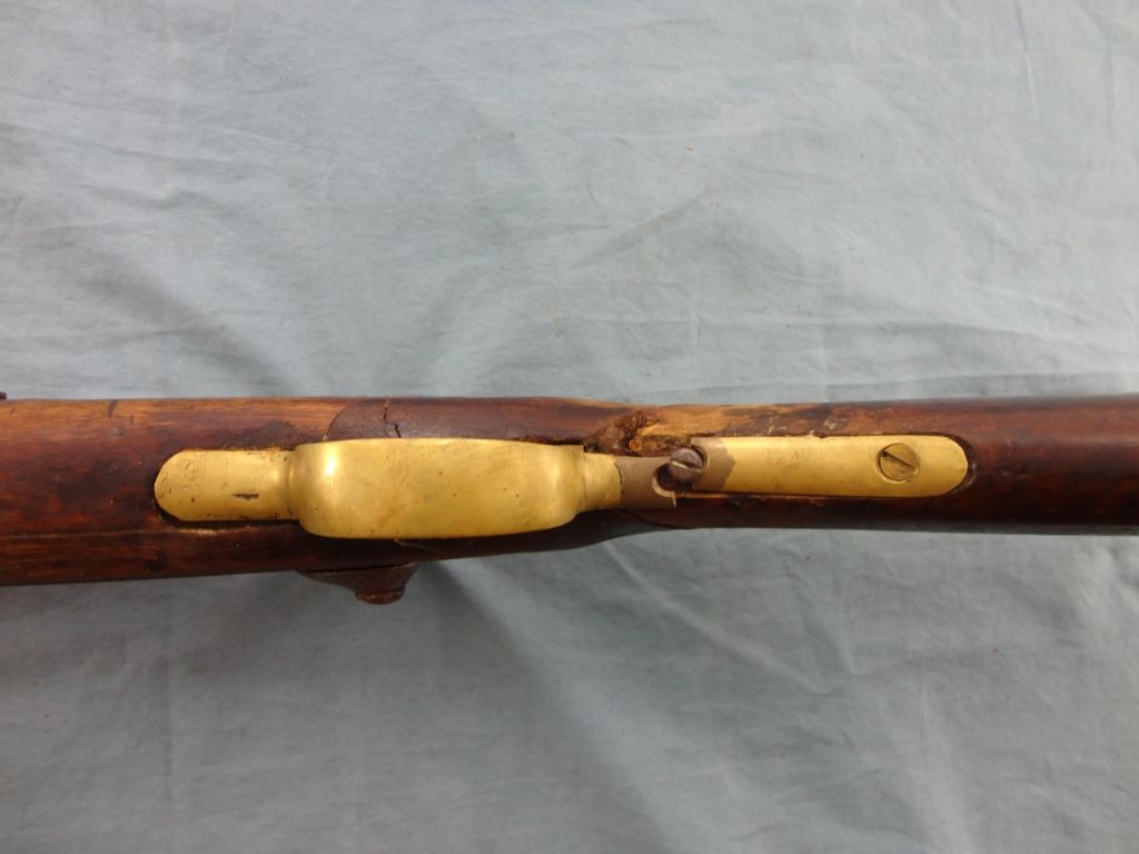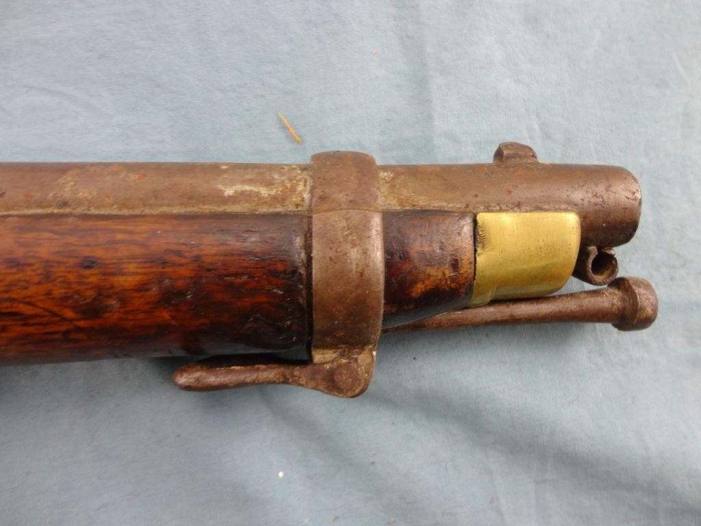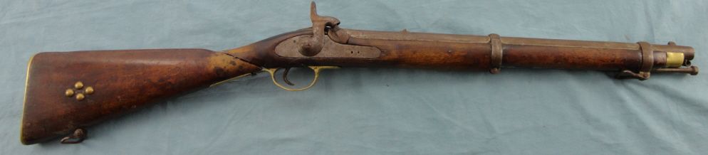 Antique, Lock is marked "1856 Tower". 19" bbl. w/2 bands. Brass end & ram rod. Stock is broken at wrist. Same as trigger guard. A historically interesting carbine which needs repair.