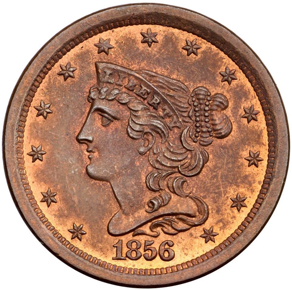 1856 C-1 R-2 MS63Bluish steel and faded mint red with 40% of the original mint red remaining on the obverse, the reverse has about 80%. There is a tiny speck of carbon at the dentils over the second A in AMERICA, free of notable marks or detraction otherwise. MDS, Manley state 2.0. Removed from a PCGS MS64RB holder (1237.64/21513151 label included).Certificate Number: Pedigree: Ex; Bowers & Merena 12/2/2004:129 - CVM - Bob Kebler Collection
