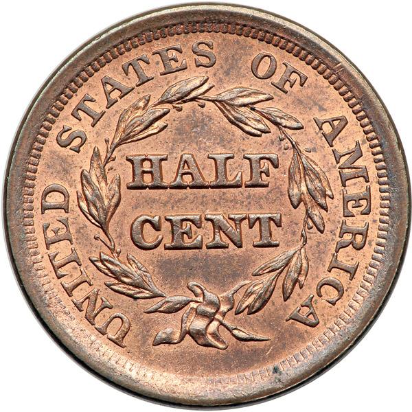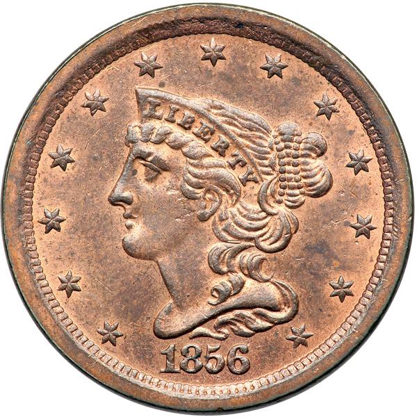 1856 C-1 R2 MS64 Prooflike. Very impressive bright original mint red fading to light steel brown on the highpoints, at least two-thirds of the mint color remaining. Close to gem but there are a few small, very shallow low spots on the cheek just left of the ear caused by a bit of debris (grease?) on the die. The best identifying marks are a tiny spot of darker toning close before the eye and another in the dentils under the tip of the wreath stem. None of these marks is at all distracting and this piece offers exceptional eye appeal. E-MDS, Manley state 2.0 early. The fields are prooflike with rather nice mirrors on both sides thanks to a fresh die polishing and there is a fine die line tangent to the leaf under ES in STATES. A premium half cent. Noyes photo #74351.