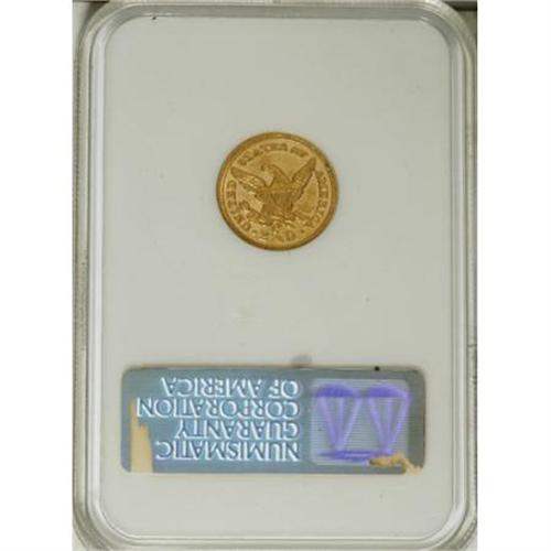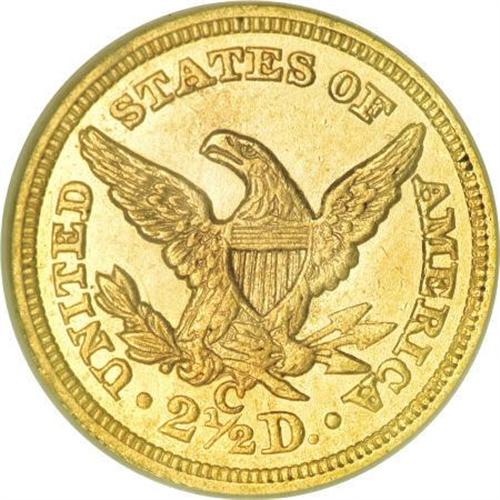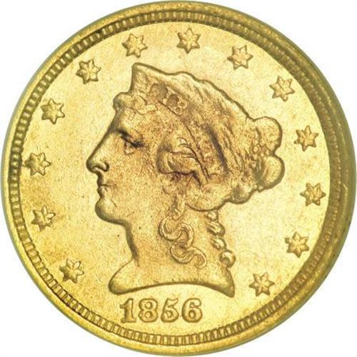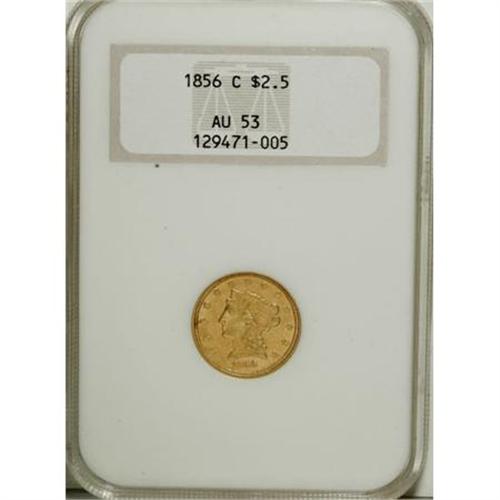 <B>1856-C $2 1/2 AU53 NGC.</B></I> Variety 17-J. Typical weak strike for the date with the hair detail on the obverse near the bun weakened by a flawed die; the reverse is sharper and quite bold in the center. The surfaces show light marks with fewer visible than usual for the date and grade. There are scattered areas of roughness from improper preparation of the planchet as seen on nearly all 1856-C quarter eagles. A majority of the original mint luster can be seen on the obverse and reverse and both sides are toned in light yellow-gold hues with pale rose shadings. This is an uncommonly nice example of a date that is almost never seen with original color and surfaces, and is equally difficult to locate with reasonably good eye appeal. This coin is housed in an old NGC holder and it appears to be undergraded by today's standards.<BR> The quarter eagles struck at Charlotte and Dahlonega in 1856 are noteworthy for being some of the most poorly prepared of all branch mint gold coins. The 1856-C is scarce in all grades with an estimated 100-125 pieces known from an original mintage of 7,913. Fewer than two dozen properly graded AUs are known and most are low end with poor eye appeal. Five or six Uncirculated coins are known with the finest being a single MS64 graded by NGC.<BR><I>From The Carolina Circle Collection.</B></I><BR><BR><B>Coin Engraver:</B> Christian Gobrecht<BR><BR><b>Shipping:</b> Coins & Currency (<a target="_blank" href="http://www.heritageauctions.com/common/shipping.php">view shipping information</a>)