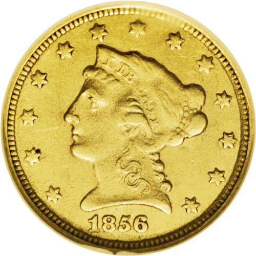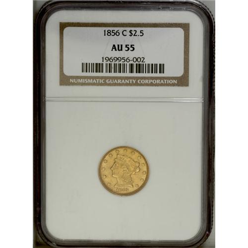 <B>1856-C $2 1/2 AU55 NGC.</B></I> Variety 17-J. This tan-gold Charlotte Mint representative has pleasing definition on the eagle, although portions of the portrait as softly defined, as usual for this challenging issue. A brief mark between star 1 and the chin serves as an identifier. Only 7,913 pieces were struck.<BR><BR><b>Shipping:</b> Coin/Currency (<a target="_blank" href="http://www.heritageauctions.com/common/shipping.php">view shipping information</a>)