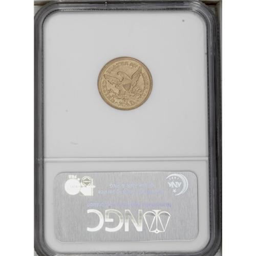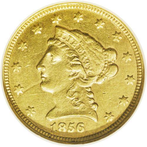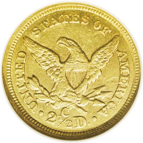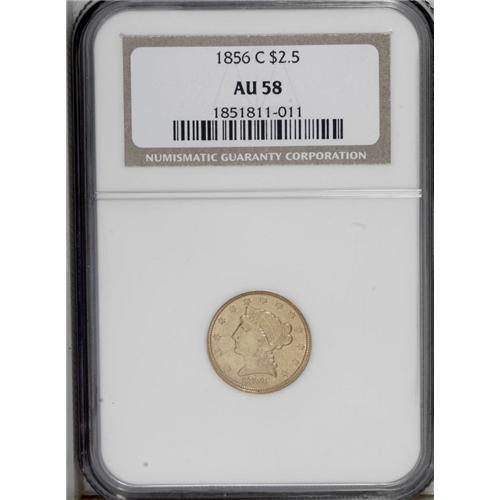 <B>1856-C<$2 1/2> AU58 NGC.</B></I> Variety 17-J. A typically softly struck but very slightly abraded example of this scarce Charlotte Mint issue. The coin's surfaces are diagnostically granular, and shallow planchet flaws are noted just below the E in AMERICA and the F in OF. A planchet streak extends from the obverse rim, beneath star 2, to Liberty's chin. A pleasing light reddish tint appears over the basic greenish color on both sides.