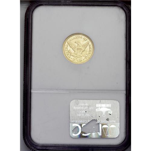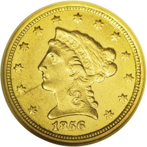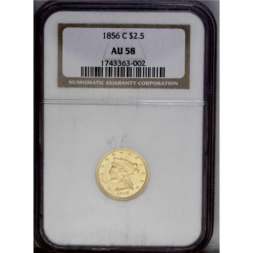 <B>1856-C<$2 1/2> AU58 NGC.</B></I> Variety 17-J. From the technical perspective, this is an exceptional piece that looks much the same today as when it first fell from the dies 150 years ago. The fields exhibit some flash, and friction is limited to highpoints such as the coronet tip and the hair above the ear. However, the major devices are bluntly struck at the centers, and the fields display several shallow mint-caused strike-throughs. Most if not all high grade survivors from the production of 7,913 pieces show similar characteristics.