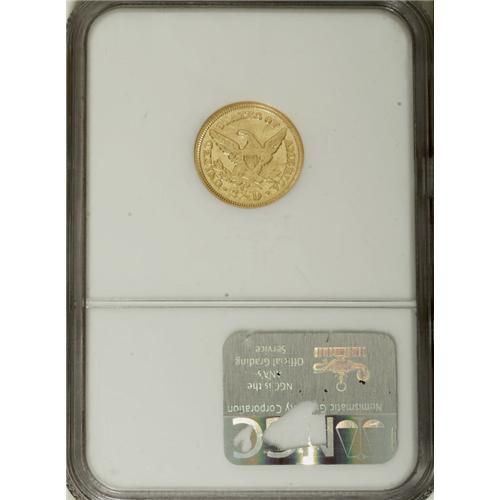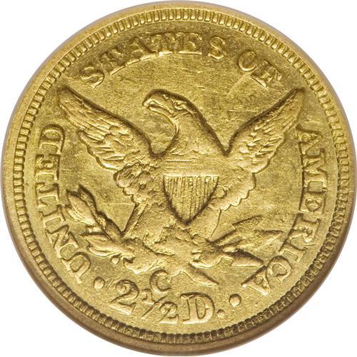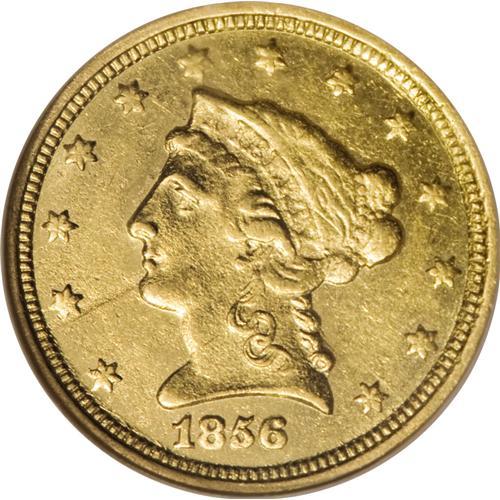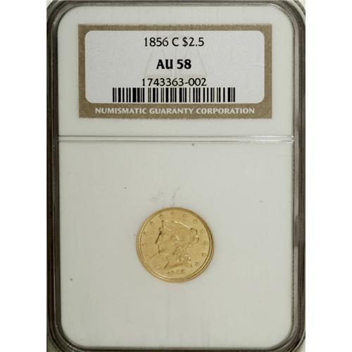 <B>1856-C $2 1/2 AU58 NGC.</B></I> Variety 17-J. From the technical perspective, this is an exceptional piece that looks much the same today as when it first fell from the dies 150 years ago. The fields exhibit some flash, and friction is limited to highpoints such as the coronet tip and the hair above the ear. However, the major devices are bluntly struck at the centers, and the fields display some shallow mint-caused strike-throughs. Most if not all high grade survivors from the production of 7,913 pieces show similar characteristics. Douglas Winter (1998) sums up the issue well: "The 1856-C quarter eagle is an extremely hard coin to find with a pleasing appearance. ... It is very rare in properly graded About Uncirculated ... ."<BR><BR><b>Shipping:</b> Coins & Currency (<a target="_blank" href="http://www.heritageauctions.com/common/shipping.php">view shipping information</a>)