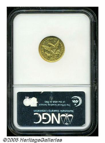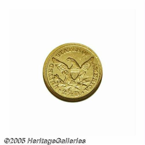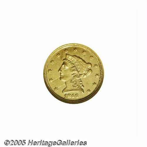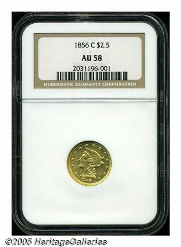<B>1856-C<$2 1/2> AU58 NGC.</B></I> Variety 17-J. This is one of the rarer Charlotte Mint Quarter Eagles, from a mintage of only 7,913 coins. Few survive above XF grade, with only 10 Mint State examples graded by NGC. In fact, that service has only certified 40 pieces in grades better than AU50. This is a pleasing greenish yellow-gold example with some surface abrasions and roughness, mostly a result of poor minting procedures or defective planchets. A shallow depression in the surface extends from Liberty's chin to the second star. Population: 13 in 58, 10 finer (5/05).