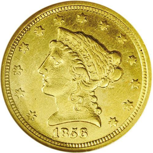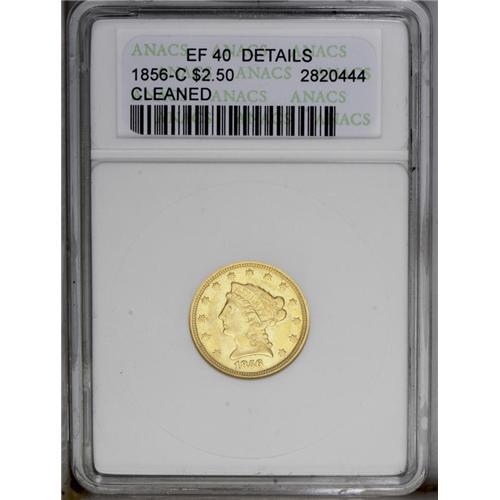 <B>1856-C<$2 1/2>--Cleaned--ANACS. XF40 Details.</B></I> Variety 17-J, the only known variety of the year. There is no doubt that this coins has been cleaned, however, it retains traces of luster with light greenish-yellow surfaces. The obverse and reverse surfaces are slightly rough, but the design details are much sharper than usually seen. <BR><BR><B>Important notice:</B> Heritage usually auctions material at the rate of 200-250 lots per hour. On some occasions eBay Live bid software or the Internet may not be able to keep up with the pace of the auction. We recommend placing a realistic absentee bid now as insurance to avoid disappointment. Occasionally the auctioneer may eliminate or reject an eBay Live bid, and the auctioneer may also reopen a lot after the close of the eBay live bidding (usually because we missed an audience bid), and may reject your bid even if it shows you as the winning bidder. By bidding via eBay Live, you agree that Heritage may award the lot to another bidder at its sole discretion under the circumstances described above or any other reasonable circumstances. Since eBay bids are not shown to us until we open the lot on the floor, we treat those bids just like floor bids. In most cases the floor responds before the eBay bid is presented to us, due to Internet lag time, so for consistency we have made it a policy that floor bids are always considered first over tie eBay live bids. Also please note that all Heritage lots purchased through eBay Live carry a 20% Buyer's Premium. Please make sure you read the Terms and Conditions before you bid. This lot is being auctioned in conjunction with a live floor auction by Heritage Galleries & Auctioneers. All final auction and invoice information will be supplied by Heritage Galleries & Auctioneers, and all other information should be considered preliminary. Lot:2398 <BR><BR><B>Winning Notification and Billing:</B> After the FINAL session in this auction is complete, Heritage will send e-mail and snail mail invoices. This process normally takes several days. All final auction and invoice information will be supplied by Heritage Galleries & Auctioneers, and all other information should be considered preliminary. <BR><BR>This auction will be conducted on a live auction floor and over the Internet through eBay Live. If you choose to place an absentee bid, please take a moment to <font color='#0000ff'><u><a href='http://pages.ebay.com/liveauctions/help/before/laabsentee.html'>learn how eBay Live absentee bidding works</a></u></font><font color='#000000'>