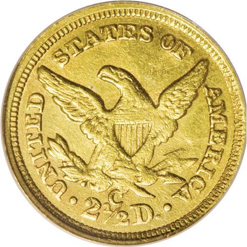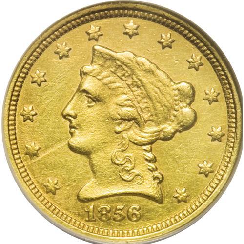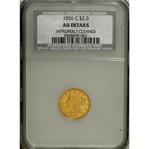 <B>1856-C $2 1/2 --Improperly Cleaned--NCS. AU Details.</B></I> Variety 17-J. This rare date Charlotte gold piece is a bit bright, but careful examination only locates inconspicuous marks on the left obverse field. Both sides exhibit shallow depressions, as made from greasy dies and found on most survivors. Portions of the centers are soft.<BR><BR><b>Shipping:</b> Coins & Currency (<a target="_blank" href="http://www.heritageauctions.com/common/shipping.php">view shipping information</a>)