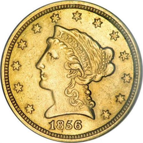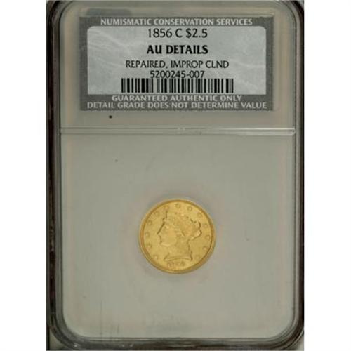 <B>1856-C $2 1/2 --Repaired, Improperly Cleaned--NCS. AU Details.</B></I> Harshly cleaned with noticeable areas of repair on the obverse and reverse. The coin will not win any beauty contest but it is an affordable example of a very scarce date. Softly struck, as always. Only 80-90 examples are believed known of this date in all grades with the majority in the VF-XF range.<BR><I>From The Carolina Circle Collection.</B></I><BR><BR><B>Coin Engraver:</B> Christian Gobrecht<BR><BR><b>Shipping:</b> Coins & Currency (<a target="_blank" href="http://www.heritageauctions.com/common/shipping.php">view shipping information</a>)