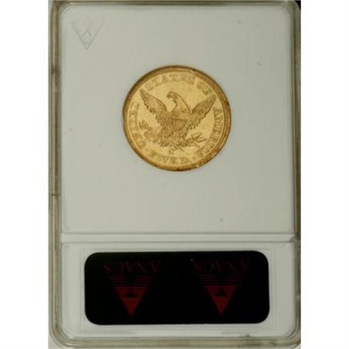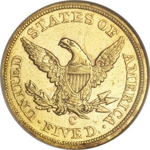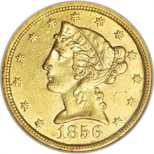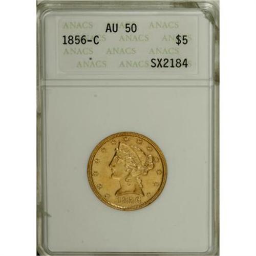 <B>1856-C $5 AU50 ANACS.</B></I> Variety 24-J, the only variety for the issue. This uncommonly attractive Charlotte half eagle has strongly lustrous yellow-gold fields and bold definition overall, though the eagle's neck feathers show a hint of the usual softness. A few light marks in the fields are not individually distracting, and on the whole, the appearance is far better than the AU50 designation would suggest. Housed in a pre-Amos Press ANACS holder.<BR><BR><B>Coin Engraver:</B> Christian Gobrecht<BR><BR><b>Shipping:</b> Coins & Currency (<a target="_blank" href="http://www.heritageauctions.com/common/shipping.php">view shipping information</a>)