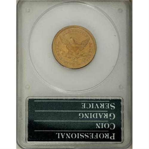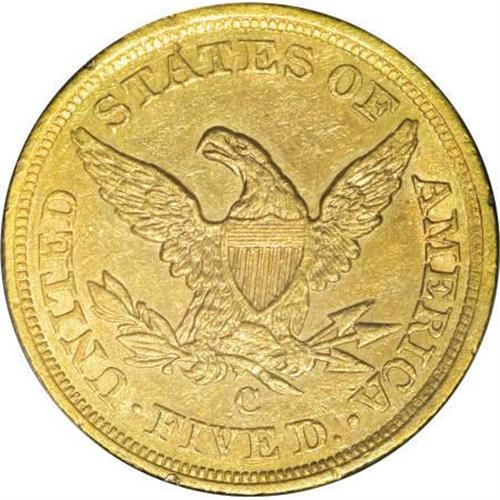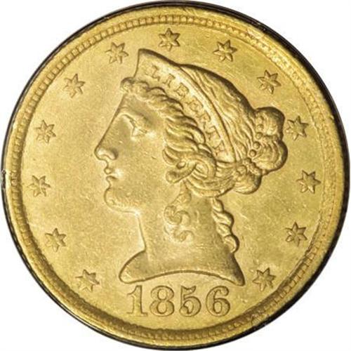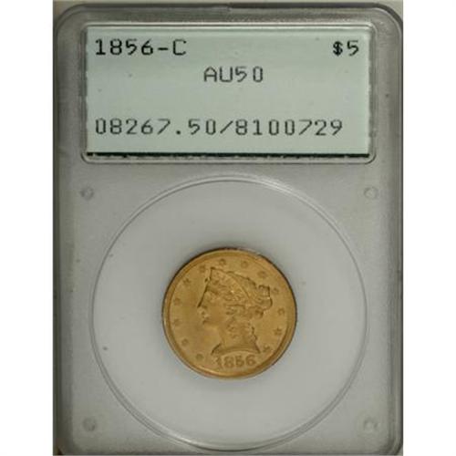 <B>1856-C $5 AU50 PCGS.</B></I> This coin has the sharpness of at least an AU55 but it appears to have been cleaned and recolored at one time. The surfaces appear to be slightly rough below the coloration. Personal inspection is recommended. Housed in an old PCGS holder.<I><BR>From The Carolina Circle Collection.</B></I><BR><BR><B>Coin Engraver:</B> Christian Gobrecht<BR><BR><b>Shipping:</b> Coins & Currency (<a target="_blank" href="http://www.heritageauctions.com/common/shipping.php">view shipping information</a>)