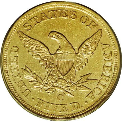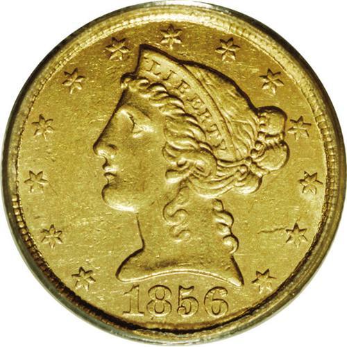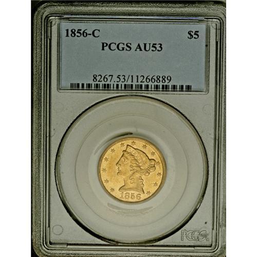 <B>1856-C $5 AU53 PCGS.</B></I> Variety 24-J. According to Doug Winter, all half eagles struck from 1855 through 1857 use the same reverse die that first appeared on a portion of the 1854 half eagles. It is interesting that a few examples of the 1855-C half eagle, from this reverse die, are known with a rim cud over AME, but this 1856-C half eagle and known 1857-C pieces have a perfect reverse. This would indicate that at least some 1855-C half eagles were struck after the 1856-C and 1857-C coins, or alternatively, that Winter's record of reverse die usage was not correct. Careful examination reveals that this reverse die, used in both 1856 and 1857, is a <I>different</B></I> die from Winter's reverse J. Mintmark positions are nearly identical, but they are not exactly the same. This light yellow-gold example has considerable luster and it is quite nicely detailed. A small abrasion inside star 12 is the only significant blemish.<BR><BR><b>Shipping:</b> Coins & Currency (<a target="_blank" href="http://www.heritageauctions.com/common/shipping.php">view shipping information</a>)