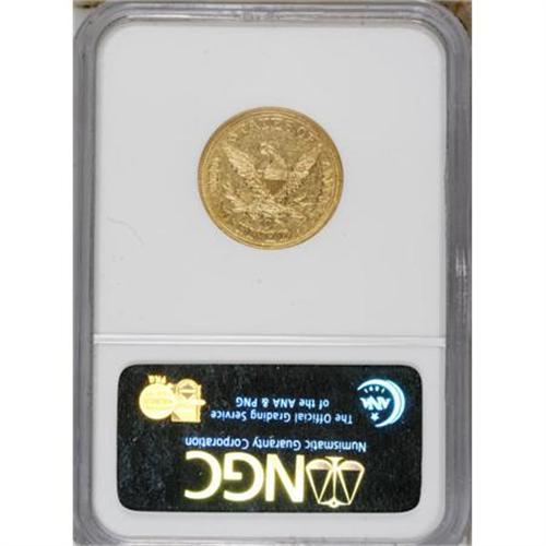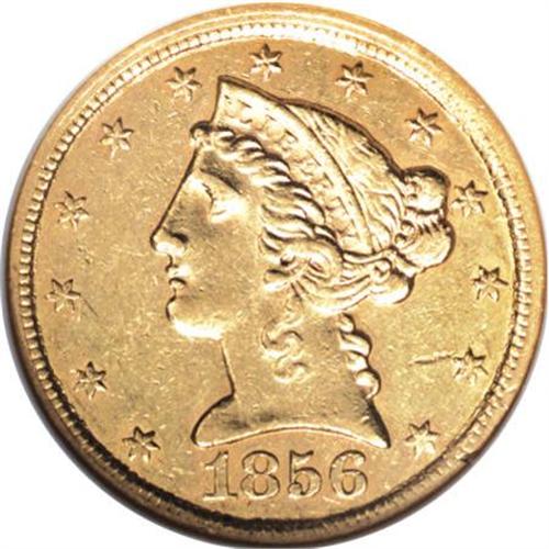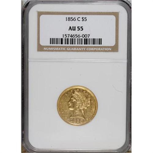 <B>1856-C $5 AU55 NGC.</B></I> Variety 24-J. Surprisingly well-defined for this issue, with only slight weakness on the portrait and the eagle's neck. The wings and shield, among other features, display uncharacteristic sharpness. The reverse of this straw-gold example displays few marks, though the obverse exhibits scattered abrasions, including one of note just to the left of star 12. Just a touch of wear is present on the highpoints.<BR><BR><b>Shipping:</b> Coins & Currency (<a target="_blank" href="http://www.heritageauctions.com/common/shipping.php">view shipping information</a>)
