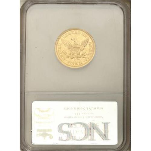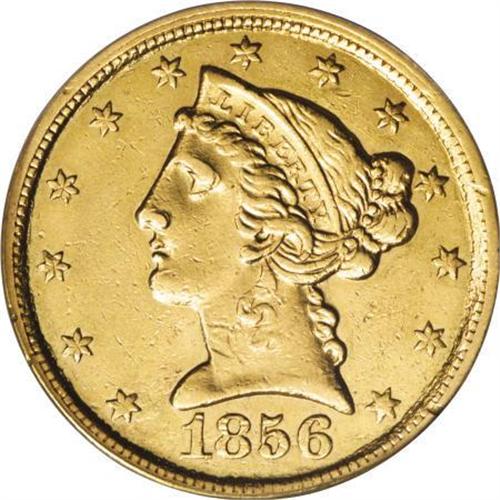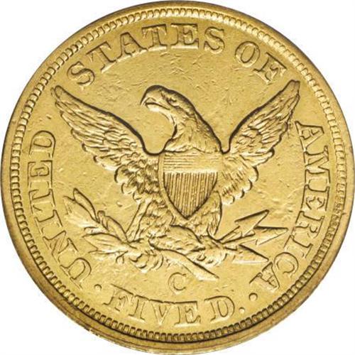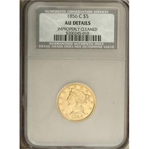 <B>1856-C $5 --Improperly Cleaned--NCS. AU Details.</B></I> Both the obverse and reverse have been harshly cleaned and the reverse shows a good deal of roughness in the planchet which is probably mint-made. Bright yellow-gold color. A scarce and underrated Charlotte issue with only 90-100 coins believed extant today out of a mintage of 28,457 pieces.<BR><I>From The Carolina Circle Collection.</B></I><BR><BR><B>Coin Engraver:</B> Christian Gobrecht<BR><BR><b>Shipping:</b> Coins & Currency (<a target="_blank" href="http://www.heritageauctions.com/common/shipping.php">view shipping information</a>)