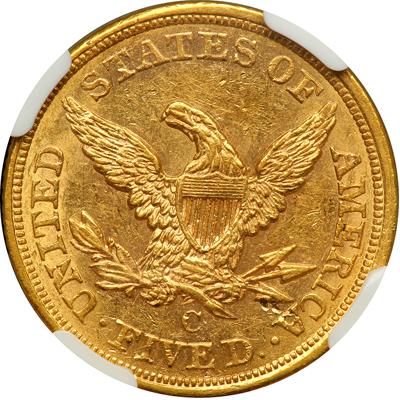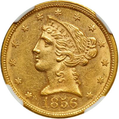 1856-C $5 Liberty. NGC graded MS-61. Well struck with plenty of luster and untoned. Some scattered light contact marks on both sides, none of which are too serious and are commensurate for this numerical grade. Only 28,457 coins struck. Nicely struck but with a few flat lower stars as often encountered on this date and mint. Liberty and the eagle are impressively bold. Desirable too is the state of the fields, which show an almost entire avoidance of marks, the most visible one being near the lowest arrowhead on the reverse. Luster abounds throughout. The 1856-C is one of the scarcer dates from this Mint. As the 1850s wound down, mintage levels fell too, with 1856-C being especially rare in mint condition, as seen in the census: Pop 7; 2 finer in 62, In a new NGC 4 pronged holder (PCGS # 8267).