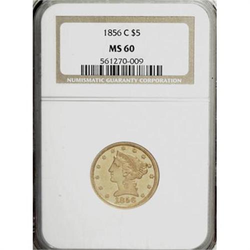 <B>1856-C $5 MS60 NGC.</B></I> Variety 24-J. This piece is considerably better detailed than the average example, and the centers are especially well brought up. Most of the denticles are sharply articulated, but a faint wire rim is noted between 3 and 5 o'clock on the obverse border, and an interesting cud appears at approximately 8 o'clock on the reverse periphery. The fields are mildly prooflike, and show the usual wispy marks that are expected for the MS60 grade. A scarce, low mintage issue of only 28,457 pieces that is seldom seen any finer than XF. Census: 6 in 60, 8 finer (11/07). <BR><I>From The Waxhaw Collection.</B></I><BR><BR><B>Coin Engraver:</B> Christian Gobrecht<BR><BR><b>Shipping:</b> Coins & Currency (<a target="_blank" href="http://www.heritageauctions.com/common/shipping.php">view shipping information</a>)