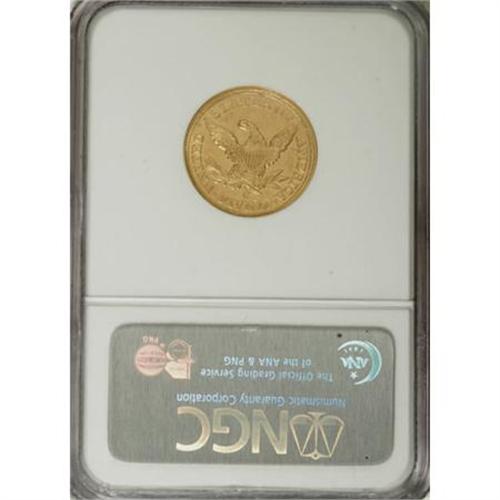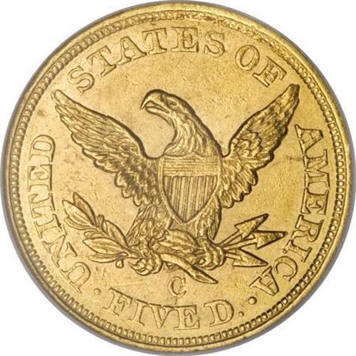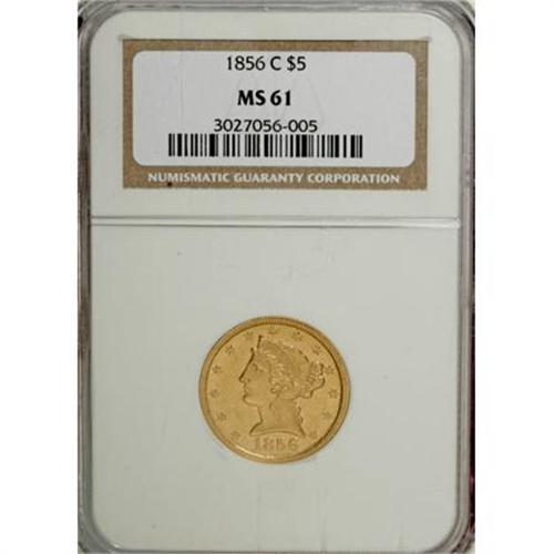<B>1856-C $5 MS61 NGC.</B></I> Variety 24-J, the only die pair for the issue. The 1856-C half eagle is still underrated, when compared to certain other Charlotte issues. While the population data of NGC and PCGS suggest that 11 examples are similar to this piece, the total certainly includes a few resubmissions. Even more telling is the fact that the two grading services have certified just three finer coins.<BR> Both sides have satiny light yellow luster with faint abrasions that are expected at this numerical grade. The surfaces are light yellow with full brilliance. This is a remarkable and highly desirable specimen. Census: 6 in 61, 2 finer (10/07).<BR><BR><B>Coin Engraver:</B> Christian Gobrecht<BR><BR><b>Shipping:</b> Coins & Currency (<a target="_blank" href="http://www.heritageauctions.com/common/shipping.php">view shipping information</a>)