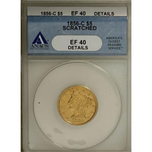 <B>1856-C $5 --Scratched--ANACS. XF40 Details. </B></I> Variety 24-J, the only known dies. A conditionally scarce issue that is quite elusive above XF. This piece is well detailed with somewhat bright surfaces that show noticeable wear and a number of minor abrasions. A heavy vertical scratch lies across Liberty's neck.<BR><I>Ex: The Marvin P. Matlock, M.D. Collection (Bowers and Merena, 3/91), lot 1757. </B></I><BR><I>From The John Stimson, Sr. Collection, Part Two.</B></I><BR><BR><B>Coin Engraver:</B> Christian Gobrecht<BR><BR><b>Shipping:</b> Coins & Currency (<a target="_blank" href="http://www.heritageauctions.com/common/shipping.php">view shipping information</a>)