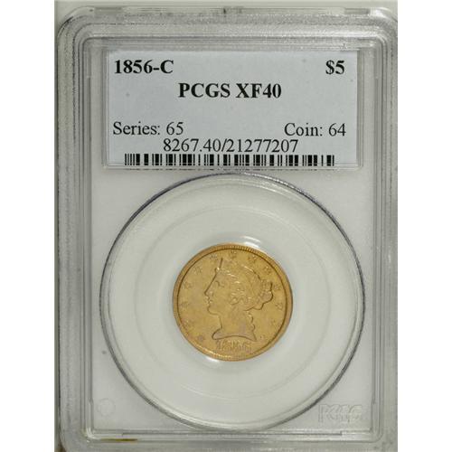 <B>1856-C $5 XF40 PCGS.</B></I> Variety 24-J. Lemon and sky-blue patina enrich this nicely defined C-mint gold piece, which retains flashes of luster within the eagle's shield, LIBERTY, and the reverse legends. Population: 19 in 40, 58 finer (1/07).<BR><BR><b>Shipping:</b> Coins & Currency (<a target="_blank" href="http://www.heritageauctions.com/common/shipping.php">view shipping information</a>)