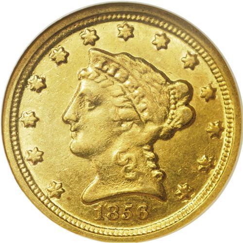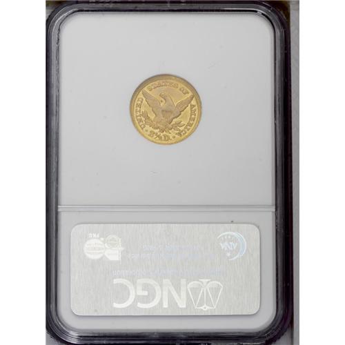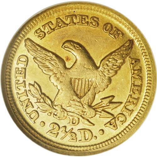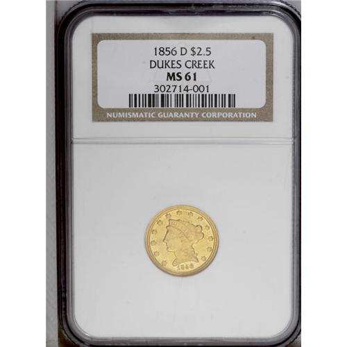 <B>1856-D<$2 1/2> MS61 NGC.</B></I> Variety 19-M. The only variety of this year.<BR> The 1856-D quarter eagle is among the most numismatically significant issues from this mint. It is the only Dahlonega gold coin ever produced with an original mintage figure of less than 1,000 pieces, and it is the single rarest issue from this mint in terms of the total number known in all grades. It is also an issue that is notorious for being among the most poorly produced United States gold coins of any era.<BR> Virtually every known 1856-D has a flat appearance with a somewhat concave "look." For collectors who are unfamiliar with this issue, most coins, even if they are original, seem cleaned. This makes the 1856-D quarter eagle a difficult issue to accurately grade.<BR> The present example shows a slightly better than average strike. The denticles on both sides are more fully formed than usual, while the wings and the reverse legend are fairly bold as well. On the obverse, there is decided weakness on the curls around the face and below the ear of Liberty. This weakness extends to the center of the reverse, which has a somewhat sunken appearance. The surfaces show some mint-made roughness, and there is a small spot below the eagle's beak. Both sides have a slight amount of luster and are overlaid with lemon-gold hues that are even and consistent.<BR> Of the 874 pieces produced, it seems unlikely that more than 50 examples are known. This includes many unattractive, lower grade pieces. There are around 10 coins known in AU, as well as a few with claims to a Mint State grade. As mentioned above, this is an incredibly difficult issue to grade--a piece that one expert calls MS61 might be regarded by another as AU55.<BR> In the Green Pond Sale, a PCGS MS60 example of this date sold for $69,000, which is apparently a record price for an 1856-D.<BR> The Duke's Creek example is certainly one of the better 1856-D quarter eagles seen and is listed on the most recent Condition Census as the fifth finest known. This is an important coin, and it is certainly one of the finer pieces currently available to collectors.<BR><I>Ex: 1993 ANA Sale (Heritage, 8/93), lot 1266; Bowers and Merena (11/93), lot 1266; Leon Farmer Collection; 1999 FUN Sale (Heritage, 1/99), lot 7657, where it brought $44,850.</B></I><BR><I>From The Duke's Creek Collection of Dahlonega Gold.</B></I>