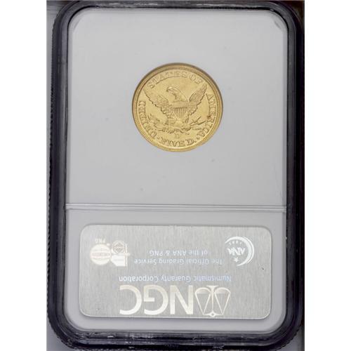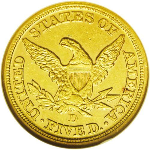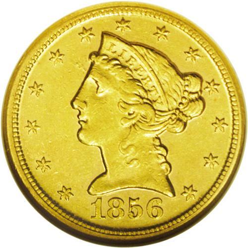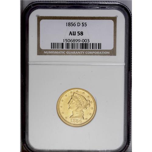 <B>1856-D<$5> AU58 NGC.</B></I> Variety 33-BB. Most high-grade examples come from a hoard that surfaced in South Carolina in the early 1990s. This lovely example has pretty sunrise-gold surfaces and a notable lack of mentionable abrasions, save for a single tick in the obverse field between star 5 and Liberty's eye. Census: 16 in 58, 8 finer (7/06).<BR><I>From The Derrick Snider Collection.</B></I>