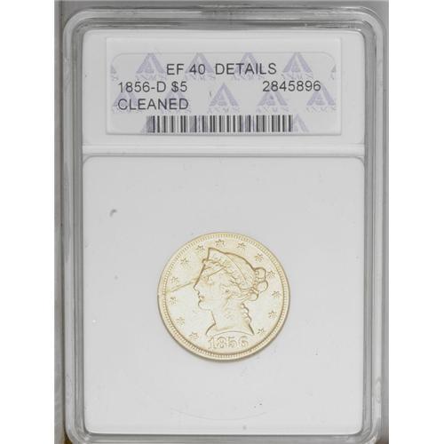 <B>1856-D<$5>--Cleaned--ANACS. XF40 Details.</B></I> Variety 33-BB. A bright and moderately hairlined yellow-gold representative of a lower mintage Dahlonega issue. A lamination streak on the upper left obverse affects the eye appeal. <BR><BR><B>Important notice:</B> Heritage usually auctions material at the rate of 200-250 lots per hour. On some occasions eBay Live bid software or the Internet may not be able to keep up with the pace of the auction. We recommend placing a realistic absentee bid now as insurance to avoid disappointment. Occasionally the auctioneer may eliminate or reject an eBay Live bid, and the auctioneer may also reopen a lot after the close of the eBay live bidding (usually because we missed an audience bid), and may reject your bid even if it shows you as the winning bidder. By bidding via eBay Live, you agree that Heritage may award the lot to another bidder at its sole discretion under the circumstances described above or any other reasonable circumstances. Since eBay bids are not shown to us until we open the lot on the floor, we treat those bids just like floor bids. In most cases the floor responds before the eBay bid is presented to us, due to Internet lag time, so for consistency we have made it a policy that floor bids are always considered first over tie eBay live bids. Also please note that all Heritage lots purchased through eBay Live carry a 20% Buyer's Premium. Please make sure you read the Terms and Conditions before you bid. This lot is being auctioned in conjunction with a live floor auction by Heritage Galleries & Auctioneers. All final auction and invoice information will be supplied by Heritage Galleries & Auctioneers, and all other information should be considered preliminary. Lot:2734 <BR><BR><B>Winning Notification and Billing:</B> After the FINAL session in this auction is complete, Heritage will send e-mail and snail mail invoices. This process normally takes several days. All final auction and invoice information will be supplied by Heritage Galleries & Auctioneers, and all other information should be considered preliminary. <BR><BR>This auction will be conducted on a live auction floor and over the Internet through eBay Live. If you choose to place an absentee bid, please take a moment to <font color='#0000ff'><u><a href='http://pages.ebay.com/liveauctions/help/before/laabsentee.html'>learn how eBay Live absentee bidding works</a></u></font><font color='#000000'>