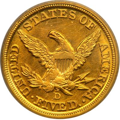 1856-D $5 Liberty. PCGS graded MS-63. An intensely lustrous beauty exhibiting rich golden sunset colors. The borders are nice and wide with most of the stars fully defined while the centeres are a trifle soft as made. Only 19,786 pieces minted.