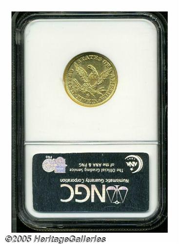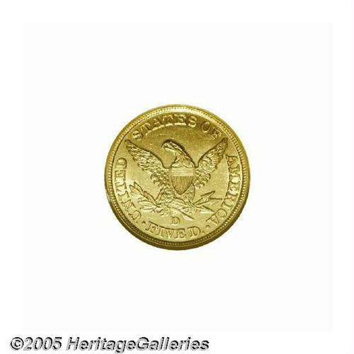 <B>1856-D<$5> MS60 NGC.</B></I> Variety 33-BB, the only currently known die pairing. Unlike its 1852-1854 counterparts, the 1856-D is one of the most difficult D-mint Half Eagles to locate in any grade. It is surpassed in high grade rarity by only the 1842-D Large Date and the 1861-D. This should come as no surprise to the specialist who is familiar with Winter's assessment of this issue. The author states that, of the 75-85 extant 1856-D Half Eagles, fewer than 15 grade AU and only 2-3 grade Mint State. This issue was generally not well produced, however both sides of the present example show sharp details including Liberty's hair and the feathers on the eagle's neck. The surfaces are pleasingly original with bright yellow-gold patina. There are several small marks in the fields, these being the probable culprits for the MS60 grade.