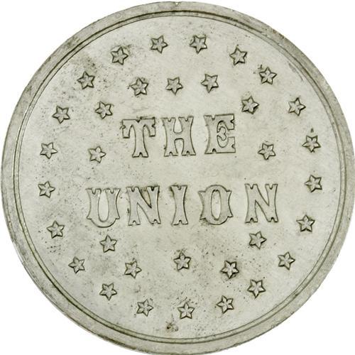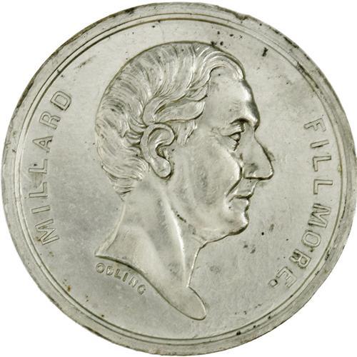 <B>1856 Millard Fillmore Campaign Medal in White Metal.</B></I> Listed as Sullivan-Dewitt MF 1856-2, measuring 39mm. This piece shares the same obverse as MF 1856-1, also offered in this sale. The engraver's name, Odling, appears on the truncation of the bust. The reverse has the words "The Union" in the center, surrounded by thirty-three stars. In almost uncirculated condition; a few minor edge dings; some adhesive residue on edges; tiny flecks visible under close examination, mentioned for strictest accuracy.
