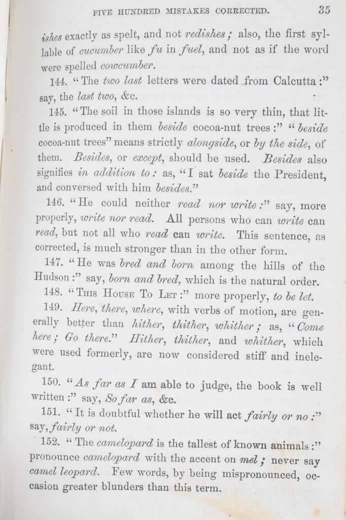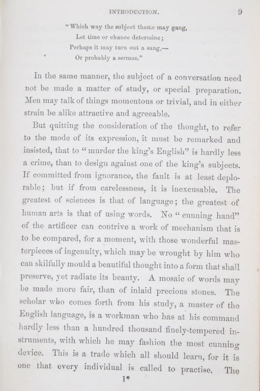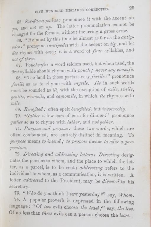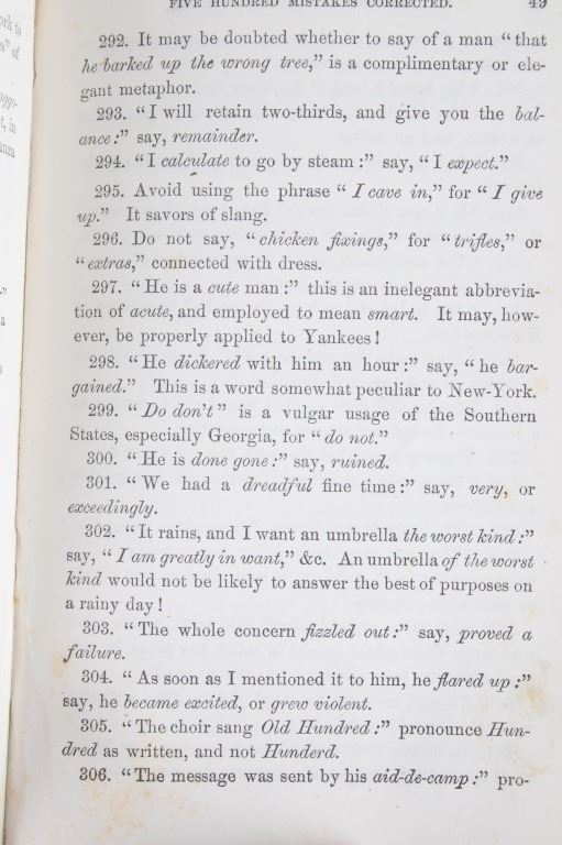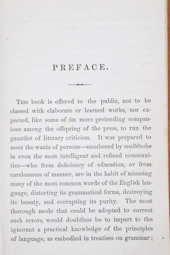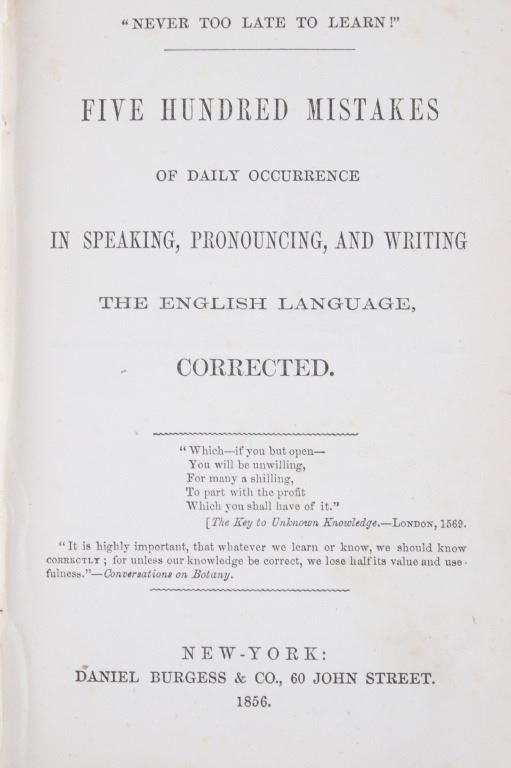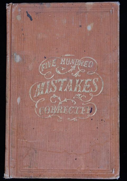 Featured in this lot is this 1856 first edition copy of “Five Hundred Mistakes of Daily Occurrence” by Walton Burgess. This is a book about mistakes in speaking, pronouncing, and writing the English language. The condition of this book is good, with wear consistent with age and use. The measurements of this book are 7 1/2" x 4 3/4".