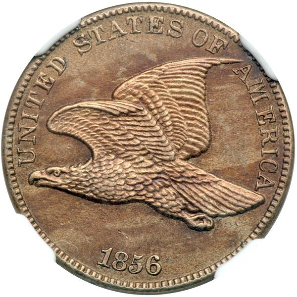 1856 Flying Eagle Cent. PCGS graded Proof 63. A popular key date. Well struck and reddish-brown. Only 2000 struck. A bold example of the most advantageous middle-range Proof grade for a collector. Its high degree of broad-spinning surface luster pulses beneath the toned highlights. Nicely struck, too, as one would expect with a carefully made Proof -- not even a hint of weakness at the usual Achilles' heel of the flying eagle cents, the ribbon bow on the reverse that ties together the twos halves of the wreath.