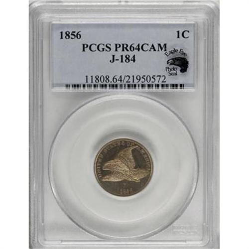 <B>1856 P1C Flying Eagle Cent, Judd-184, Pollock-220, Low R.7, PR64 Cameo PCGS.</B></I> Eagle Eye Photo Seal. The obverse is the same as the famous Judd-180 Flying Eagle cent, the Snow obverse 2 with a pointed U in UNITED. The reverse has an oak wreath with the denomination ONE CENT and ornamental shield above. Believed to be a restrike mule, as the reverse was probably created in 1858. Thus, these are considered a "fantasy pieces." Nevertheless, these pieces have long been considered an integral part of the pattern series and are avidly sought after by Flying Eagle and Indian cent collectors as well as pattern specialists. A flashy, unabraded, and well struck near-Gem that has minor obverse carbon flecks.<BR><I>From The New York Eye Appeal Collection, Part Three.</B></I><BR><BR><b>Shipping:</b> Coins & Currency (<a target="_blank" href="http://www.heritageauctions.com/common/shipping.php">view shipping information</a>)