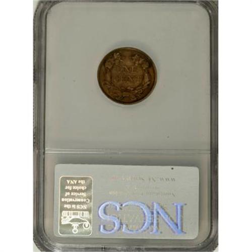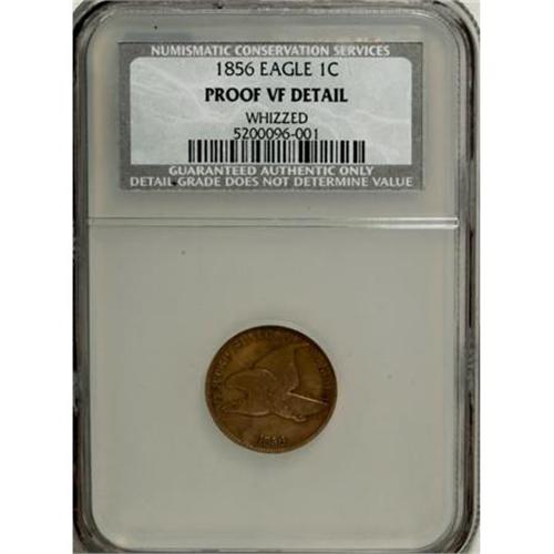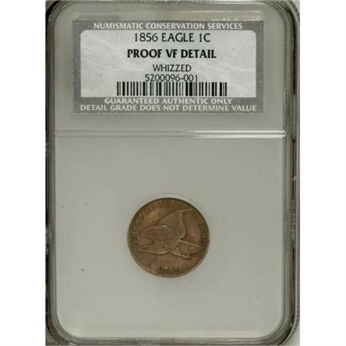 <B>1856 1C --Whizzed--NCS. Proof, Very Fine Details.</B></I> Snow-9. The surfaces show overbrightness and the fine metal movement characteristic of whizzing. The 1 and 8 in the date show minor damage on each digit, but the all-important 5 and 6 are bold. This piece likely saw light circulation some time before its "improvement," but much detail remains, making this piece an affordable choice to complete that last key date in the Indian and Flying Eagle collection.<BR><BR><B>Coin Engraver:</B> James B. Longacre<BR><BR><b>Shipping:</b> Coins & Currency (<a target="_blank" href="http://www.heritageauctions.com/common/shipping.php">view shipping information</a>)
