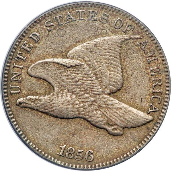 The first flying eagle motif was used to make at least two master dies, one with Style of 1856 letters used for all 1856 cents and some early 1857 cents; and the Style of 1857 letters used to make most 1857 and about half of the 1858 cents. This first flying eagle motif had smoothed feathers at the top of the neck, as here, a complete circle or ring around the eye, and a few other features differing from the other style.
