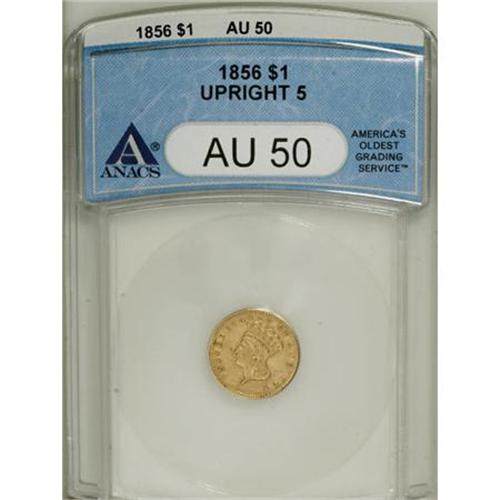 <B>1856 G$1 Upright 5 AU50 ANACS.</B></I> PCGS Population (17/28). NGC Census: (0/0). (#7541)<BR><BR><b>Shipping:</b> Coins & Currency (<a target="_blank" href="http://www.heritageauctions.com/common/shipping.php">view shipping information</a>)