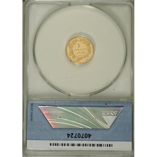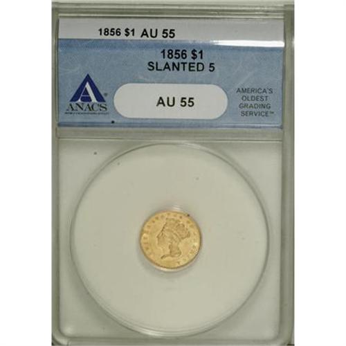 <B>1856 G$1 Slanted 5 AU55 ANACS.</B></I> NGC Census: (66/1339). PCGS Population (140/670). Mintage: 1,762,936. Numismedia Wsl. Price for NGC/PCGS coin in AU55: $198. (#7540)<BR><BR><B>Coin Engraver:</B> James B. Longacre<BR><BR><b>Shipping:</b> Coins & Currency (<a target="_blank" href="http://www.heritageauctions.com/common/shipping.php">view shipping information</a>)