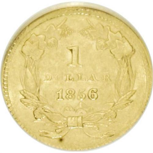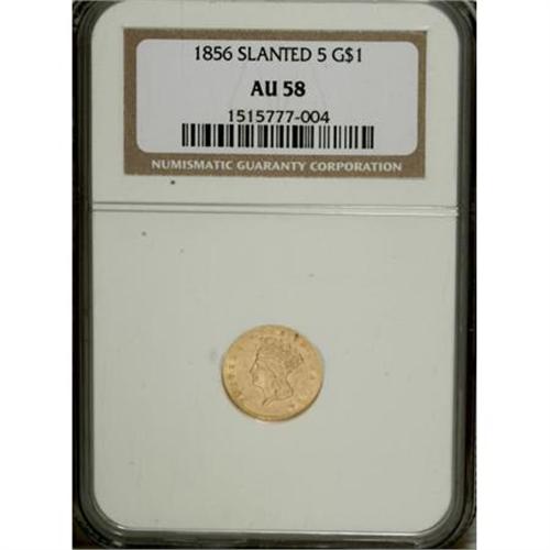 <B>1856 G$1 Slanted 5 AU58 NGC.</B></I> NGC Census: (338/998). PCGS Population (177/493). Mintage: 1,762,936. Numismedia Wsl. Price for NGC/PCGS coin in AU58: $215. (#7540)<BR><BR><B>Coin Engraver:</B> James B. Longacre<BR><BR><b>Shipping:</b> Coins & Currency (<a target="_blank" href="http://www.heritageauctions.com/common/shipping.php">view shipping information</a>)