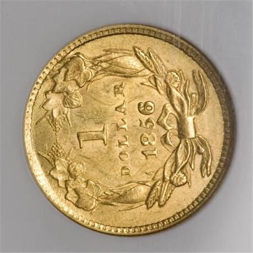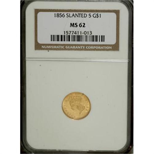 <B>1856 G$1 Slanted 5 MS62 NGC.</B></I> NGC Census: (391/252). PCGS Population (153/231). Mintage: 1,762,936. Numismedia Wsl. Price for NGC/PCGS coin in MS62: $430. (#7540)<BR><BR><B>Coin Engraver:</B> James B. Longacre<BR><BR><b>Shipping:</b> Coins & Currency (<a target="_blank" href="http://www.heritageauctions.com/common/shipping.php">view shipping information</a>)