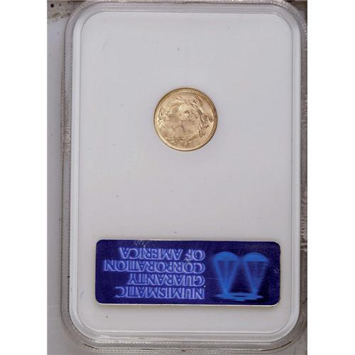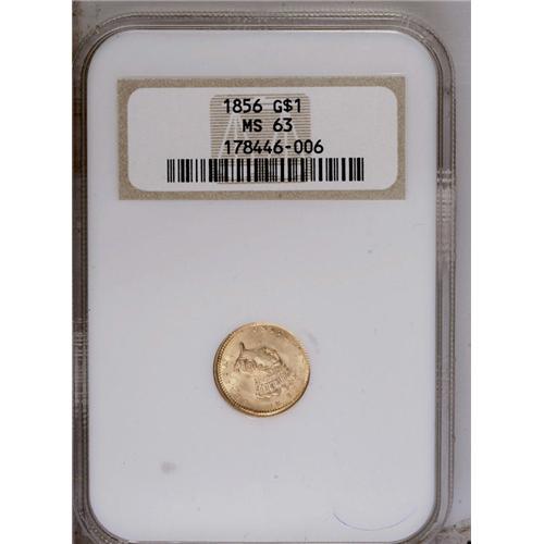 <B>1856<G$1> Slanted 5 MS63 NGC.</B></I> Hints of lilac toning visit the highpoints of this lustrous straw-gold example. Striking softness is limited to portions of the left side dentils. Housed in a prior generation holder.