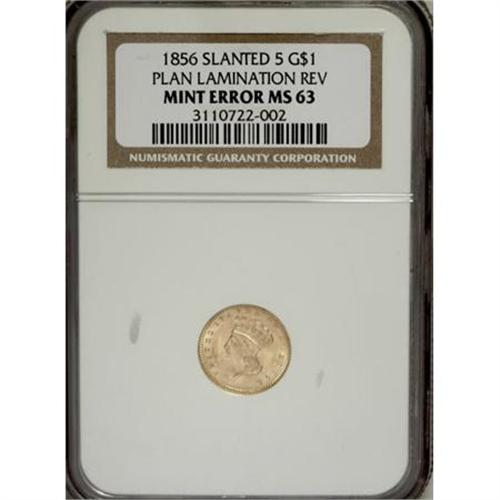 <B>1856 G$1 Gold Dollar Slanted 5--Planchet Lamination Reverse--MS63 NGC.</B></I><BR><BR><B>Coin Engraver:</B> James B. Longacre<BR><BR><b>Shipping:</b> Coins & Currency (<a target="_blank" href="http://www.heritageauctions.com/common/shipping.php">view shipping information</a>)