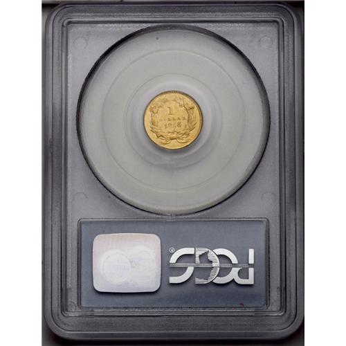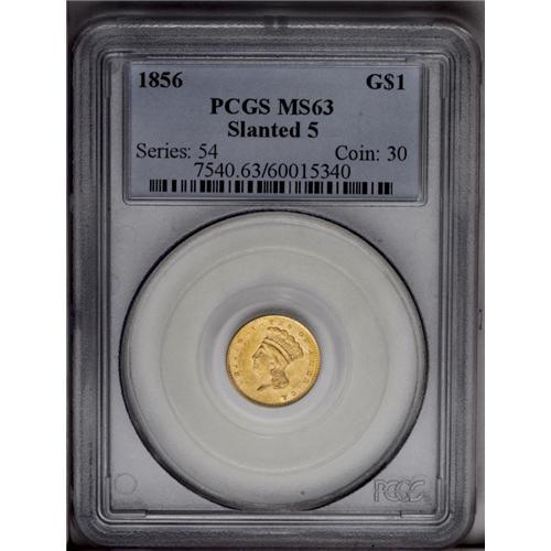 <B>1856<G$1> Slanted 5 MS63 PCGS.</B></I> A slightly more available issue than its Upright 5 sibling, the Slanted 5 is the hallmark of Mint Engraver James B. Longacre. This piece has good luster over apricot-gold surfaces, but there is some weakness on the O in DOLLAR, the 5, and the A in STATES. Elsewhere the strike is pleasing, and the overall eye appeal is high.