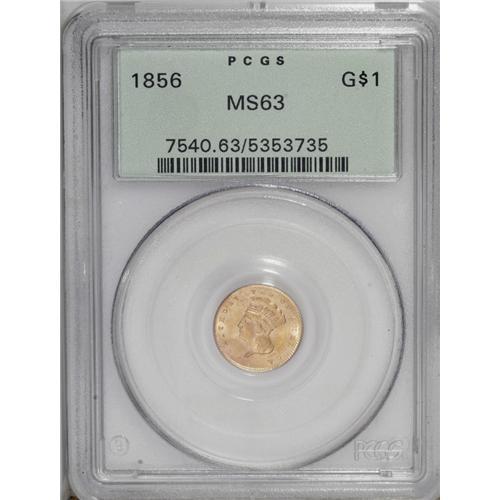 <B>1856<G$1> Slanted 5 MS63 PCGS.</B></I> The surfaces drip with satin-like frost on this attractive example of this date.