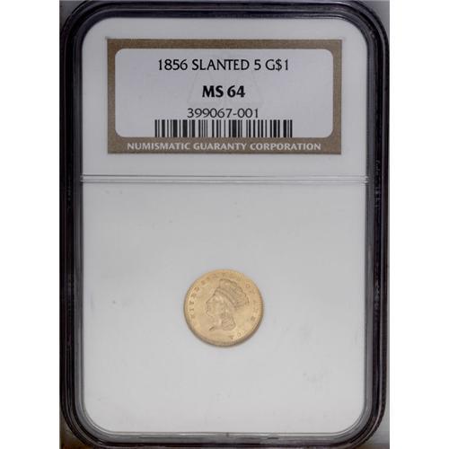 1856 G$1 Slanted 5 MS64 NGC. B-6047. Slanted 5, Heavy