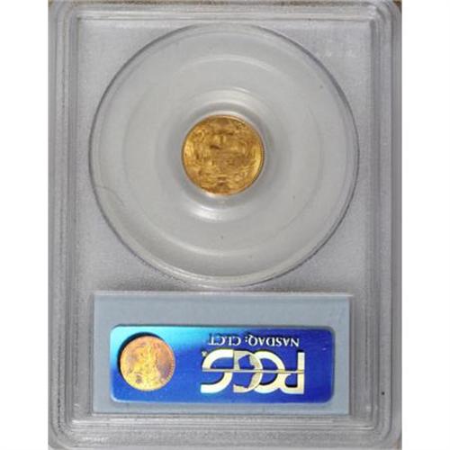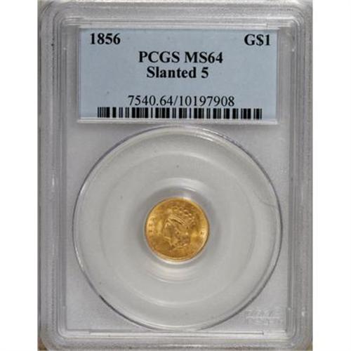 <B>1856 G$1 Slanted 5 MS64 PCGS.</B></I> Satiny luster enhances both sides of this well struck representative. Uncommonly appealing for the grade with above-average preservation, and a great candidate for one's gold type set. Population: 65 in 64, 24 finer (7/07).<BR><BR><B>Coin Engraver:</B> James B. Longacre<BR><BR><b>Shipping:</b> Coins & Currency (<a target="_blank" href="http://www.heritageauctions.com/common/shipping.php">view shipping information</a>)