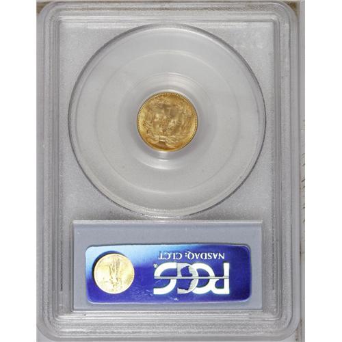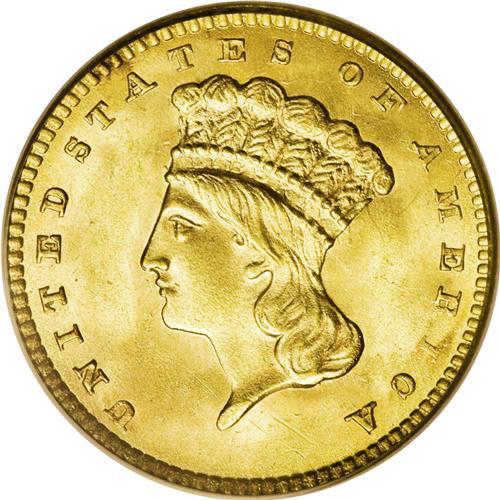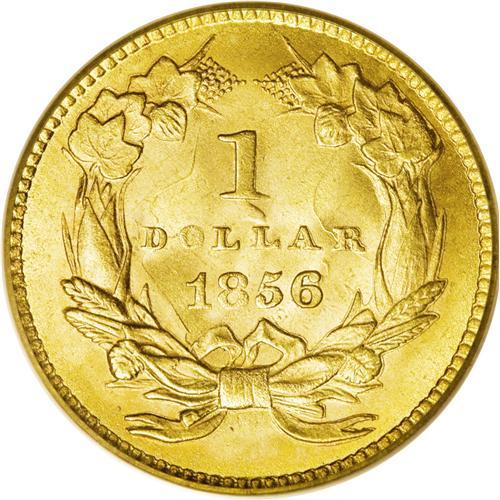 <B>1856 G$1 Slanted 5 MS65 PCGS.</B></I> Despite a generous mintage, the 1856 gold dollar is surprisingly rare as a Gem. In fact, it is scarcer in MS65 and higher grades than the 1886, which had an emission of only 5,000 pieces. This lustrous and smooth representative has orange borders and green-gold centers. Struck from prominently clashed dies. Population: 14 in 65, 9 finer (10/06).<BR><BR><b>Shipping:</b> Coin/Currency (<a target="_blank" href="http://www.heritageauctions.com/common/shipping.php">view shipping information</a>)